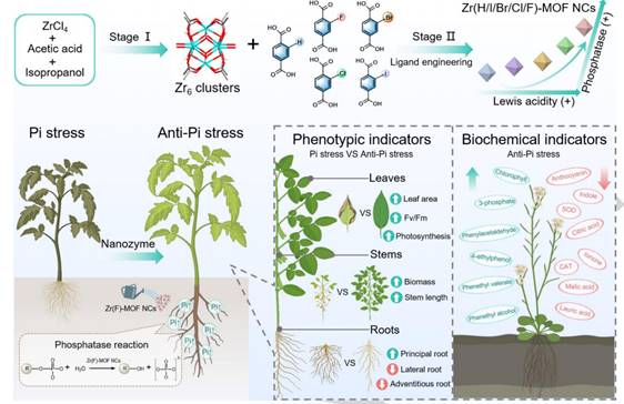 在精准催化与植物营养管理的交叉领域,纳米酶技术正推动植物抗逆策略实现从分子设计到农业应用的跨越。这一目标的实现,要求纳米酶需要在复杂的植物基质中按需清除损伤物或生成营养物且不发生副反应。为此,团队首先聚焦于提升单原子纳米酶的催化选择性这一核心问题,系统阐述了其空间配位结构与选择性催化行为的构效关系,并进一步提出了面向特定酶促反应的配位结构设计原则及其合成集成策略。随后,团队面向植物低磷胁迫这一粮食安全痛点,创新的研发出基于纳米酶的解决方法新思路。利用配体工程赋予Zr MOF纳米酶领先的磷酸酶活性,水解土壤中固定的有机磷释放植物可利用的无机磷实现缓解低磷胁迫。