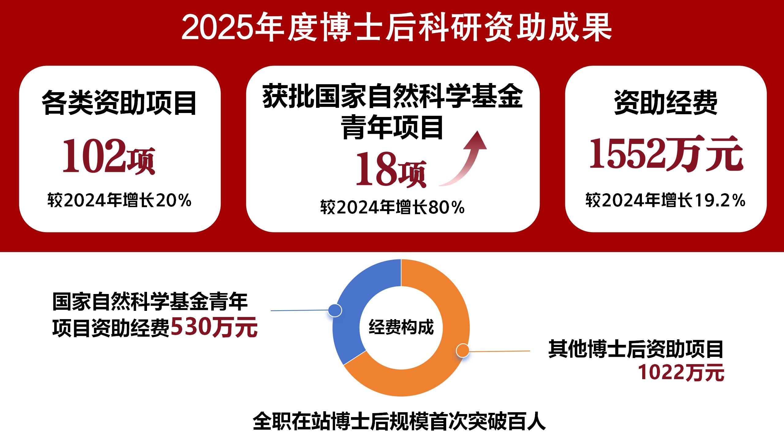 截至目前,2025年度我校博士后共获批科研项目102项、争取资助经费1552万元。其中中国博士后特别资助、面上资助、国资计划、科研业绩评估、黑龙江省博士后择优资助等各类项目均公布结果,我校共获批84项,争取资助经费1022万元。与2024年相比,获批项目增加9项、增幅12%,资助经费增加199万元、增幅24.2%,实现项目数量与经费规模双大幅增长。全职博士后科研创新能力持续凸显,2025年获批国家自然科学基金青年项目18项,争取资助经费530万元,较2024年增加8项、增幅80%,资助经费增加230万元、增幅76.7%;全职在站博士后规模首次突破百人,队伍发展迈上新台阶。